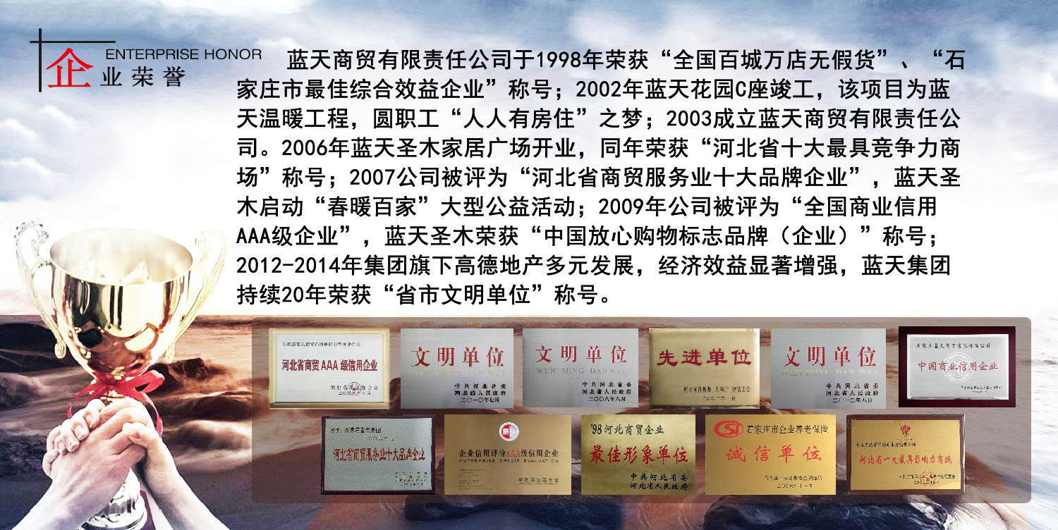 石家莊藍(lán)天商貿(mào)有限責(zé)任公司,成立于1992年10月28日,前身是石家莊長(zhǎng)安五交化公司,目前旗下包含藍(lán)天圣木家居廣場(chǎng)、藍(lán)天奧特萊斯、藍(lán)天五交化商場(chǎng)、藍(lán)天高德房地產(chǎn)4家子公司。 藍(lán)天圣木家居廣場(chǎng)是省會(huì)大型中高檔家居賣場(chǎng)之一,賣場(chǎng)經(jīng)營(yíng)面積3萬多平方米,位于省會(huì)黃金地段,是省會(huì)重...